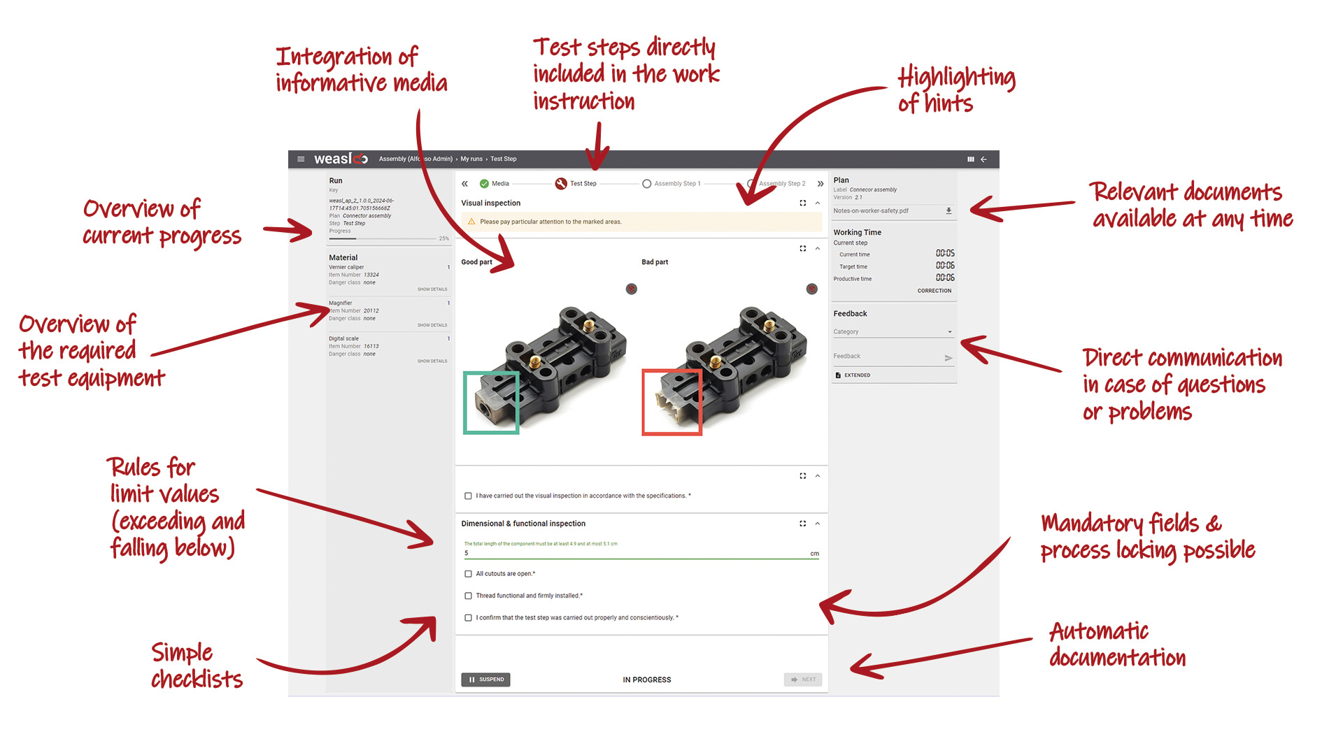 die nahtlose Integration der Prüfschritte in die laufenden Arbeitsanweisungen (ohne Arbeitsplatzwechsel, ohne Einschränkungen bei komplexeren Prozessen)