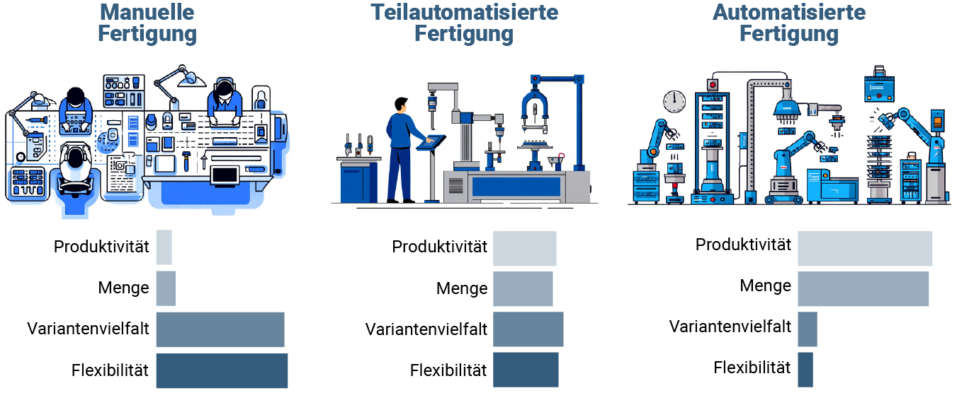 Lassen Sie uns für die Automatisierung der Fertigungsmethoden einmal Prozentwerte vergeben. Die manuelle Fertigung liegt dabei bei 0 % Automatisierung.
